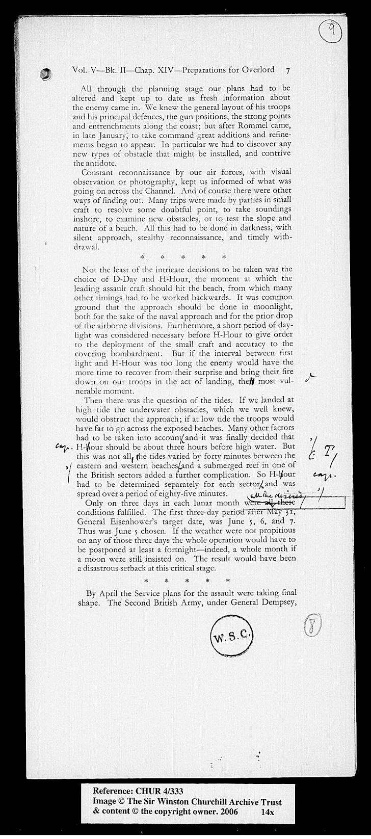 Churchill wrote the book, with a team of assistants, using both his own notes and privileged access to official documents while still working as a politician. The fifth volume, from which this extract is taken, was published in 1951, but this is a draft which was written between 1949 and 1951. In this chapter, Churchill discusses the planning and preparation for Operation Overlord, the Allied invasion of Normandy in June 1944.