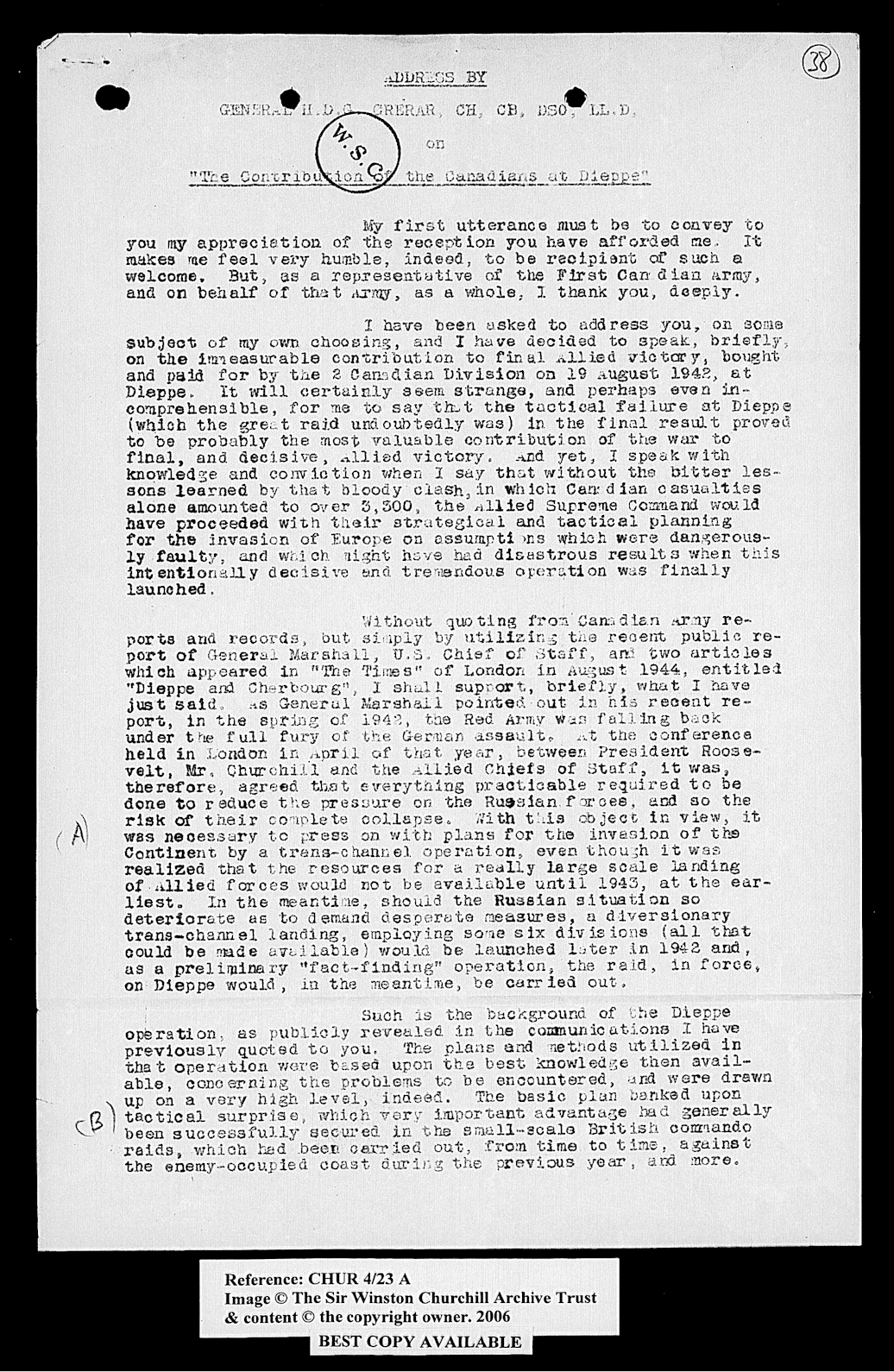 I have been asked to address you, on some subject of my own choosing, and I have decided to speak, briefly, on the immeasurable contribution to final allied victory, bought and paid for by the 2 Canadian Division on 19 August 1942, at Dieppe. It will certainly seem strange, and perhaps even incomprehensible, for me to say that the tactical failure at Dieppe (which the great raid undoubtedly was) in the final result proved to be probably the most valuable contribution of the war to final, and decisive, allied victory. And yet, I speak with knowledge and conviction when I say that without the bitter lessons learned by that bloody clash, in which Canadian casualties alone amounted to over 3,300, the Allied Supreme Command would have proceeded with their strategical and tactical planning for the invasion of Europe on assumptions which were dangerously faulty, and which might have had disastrous results when this intentionally decisive and tremendous operation was finally launched.